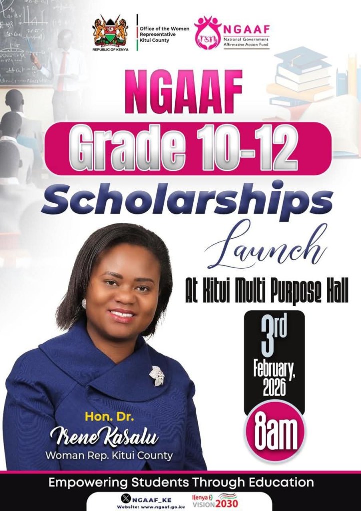 The Office of the Woman Representative for Kitui County, in collaboration with the National Government Affirmative Action Fund (NGAAF), is set to launch the NGAAF Grade 10–12 Scholarships, a programme aimed at supporting secondary school students across the county.The scholarship targets learners in Grades 10 to 12 and seeks to ease the financial burden on families while ensuring students remain in school and complete their secondary education. The initiative reflects a broader commitment to education as a tool for empowerment and social transformation.The official launch will be held on 3rd February 2026 at the Kitui Multi-Purpose Hall, starting from 8:00 a.m. The event will be hosted by Hon. Dr. Irene Kasalu, the Woman Representative for Kitui County and incoming Governor of Kitui County.The programme is expected to benefit students from vulnerable and disadvantaged backgrounds, reinforcing the principles of affirmative action and inclusive development. Education stakeholders, parents, students, and community members are encouraged to attend the launch and engage on the scholarship’s objectives, eligibility, and application process.The NGAAF scholarship initiative aligns with Kenya’s broader development agenda under Vision 2030, underscoring education as a cornerstone for sustainable development and future leadership in Kitui County.